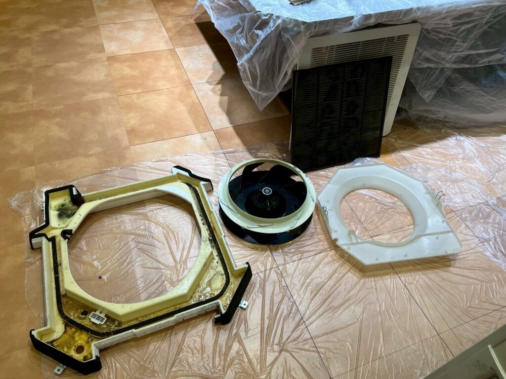 エアコンも分解して一緒にパーツ洗浄や内部洗浄をおこないます。